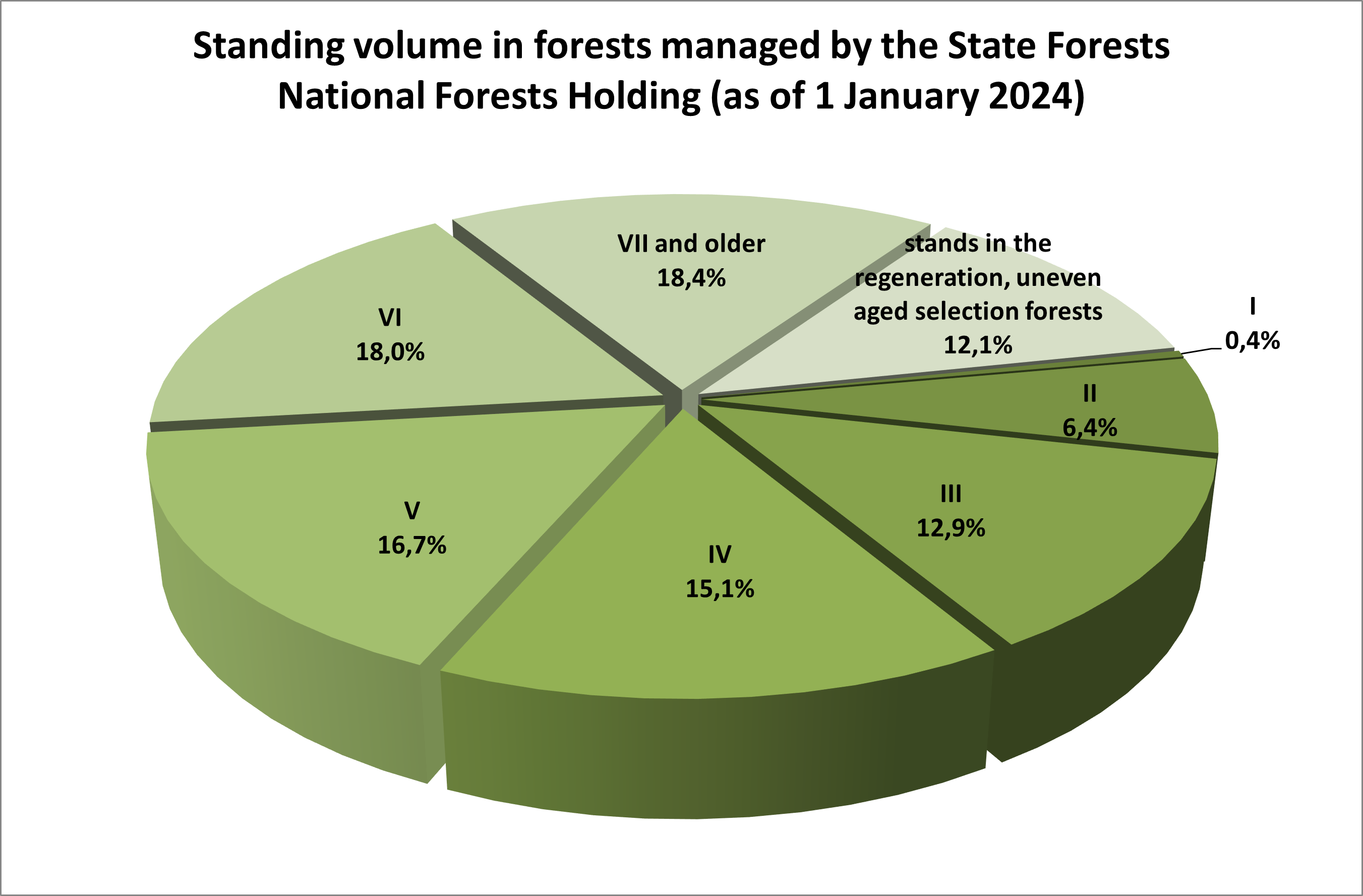 The total area of forests administerd by the State Forests – as of 1 January 2024 amounted to 7 144,1 thousand hectares, growing stock - 1 926 mln m3 with an average stand age of about 64 years. The average volume on afforested land is 275 m3/ha.